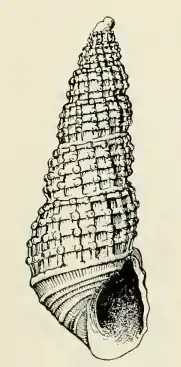 The milk-white shell has an elongate-conic shape. Its length measures 4.5 mm. There are at least two whorls in the protoconch. These are smooth, deeply obliquely immersed in the first of the succeeding turns, above which only a portion of the last two turns project. The seven whorls of the teleoconch are moderately rounded, strongly constricted at the sutures, and slopingly shouldered at the summit. They are ornamented by strong, retractive axial ribs of which 14 occur upon the first, 16 upon the second to fourth, 18 upon the fifth, and 20 upon the penultimate turn. In addition to the axial ribs, the whorls are marked by spiral cords between the sutures, which are a little more than half as strong as the ribs and of which three occur upon the first three whorls and four upon the succeeding turns. The second one below the summit marks the angle of the long sloping shoulder. The junction of the ribs and the cords are strongly nodulous. The spaces inclosed between them are deep squarish pits. The sutures are strongly channeled. The periphery of the body whorl is marked by a broad groove that is crossed by the continuations of the axial ribs which terminate at the posterior margin of the first basal keel. The base of the body whorl is well rounded. It is marked by six spiral cords which are of unequal strength, separated by grooves of different widths, which are crossed by fine axial threads. The aperture is oval, and effuse anteriorly; The posterior angle is obtuse. The thin outer lip is rendered sinuous by the cords. It shows the external sculpture within. The columella is slender, strongly reflected, and provided with a fold at its insertion.[3]