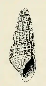 The vitreous shell has a conic shape. Its length measures 3.4 mm. The whorls of the protoconch are small, smooth, obliquely deeply immersed in the first of the succeeding turns, above which only the tilted edge of the last volution projects. The six whorls of the teleoconch are flattened, strongly contracted at the periphery and moderately shouldered at the summit. They are marked by moderately strong, almost vertical, axial ribs, of which 16 occur upon the second and third, 18 upon the fourth, 20 upon the fifth, and 22 upon the penultimate turn. In addition to the axial ribs, the whorls are marked by four slender spiral cords between the sutures, the junction of which, with the axial ribs, renders them feebly nodulous. The spaces enclosed by the ribs and cords are well impressed squarish pits. The sutures are strongly channeled. The periphery is marked by a slender spiral cord, on the posterior edge of which the axial ribs terminate. The base of the body whorl is well rounded, and slightly attenuated anteriorly. It is marked by twelve spiral cords which grow successively weaker from the periphery to the umbilical area. The aperture is oval. The posterior angle is acute. The outer lip is thin, showing the external sculpture within, rendered sinuous by the spiral cords. The columella is slender, slightly reflected and reinforced by the base. It is provided with a slender fold at its insertion.[3]