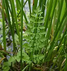 The leaves vary widely in shape, with the upper ones being typically pinnate and having narrow, almost linear segments, while the lower ones can be 2- or even 3-times pinnate, with broader, flat leaflets, more like those of other umbellifers. The leaf stalks of the upper leaves are fistular, like the stem, and longer than the pinnate leaf blade.[2]