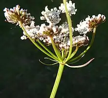 It flowers between June and September in northern Europe, with umbels of 5-9 smaller umbels about 1-2 cm in diameter, each of which has numerous white flowers. There are about 5 awl-shaped bracts on the main umbel and 5-7 small bracteoles at the base of each of the individual umbellules. Plants are monoecious, with hermaphroditic and male flowers in all umbels, but the proportion of hermaphroditic flowers decreases as the season progresses. Each flower has 5 unequal petals with the larger, outer ones slightly larger, 5 stamens and 2 prominent styles arising from a swollen base (stylopodium) at the top of the ovary. After flowering, the flower stalks do not expand (as they do in some other species of water-dropwort) and the umbels do not become flat-topped.[1][3]