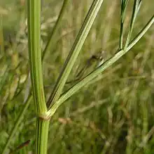 Parsley water-dropwort is a hairless perennial growing up to 100 cm tall with solid (sometimes becoming hollow with age), striated, cylindrical stems 0.4 cm in diameter. The roots are somewhat swollen, cylindrical in shape, but lacking the distinct tubers that occur in some other members of the genus. The upper leaves are once to twice pinnate with simple linear leaflets up to 5 cm long; the lower ones are twice pinnate, with wider, flat leaflets, more like those of other umbellifers. The leaf stalks are shorter than the leaf blade, sheathing the stem at the base, and with a celery scent.[1][2]