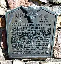 The first road through Ogden Canyon was built by Lorin Farr and Isaac Goodale. A toll gate was established in 1860, and from 1865 to 1882 was operated by the Ogden Canyon Road Company. It became a public road in 1882.[3]