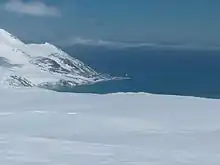 Ogosta Point from Willan Saddle, with Huntress Glacier in the foreground and Deception Island in the background.