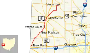 State Route 121 (SR 121) is a state highway in western Ohio. It starts at Indiana State Road 121 near New Paris, Ohio, and ends at State Route 47 and State Route 185 in Versailles, Ohio.