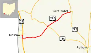 State Route 743 (SR 743) is a short east–west state highway in southwestern Ohio, a U.S. state. The highway's western terminus is in the village of Moscow at the intersection of Wells Street and 5th Street, a mere two blocks off of U.S. Route 52 (US 52). Traversing Clermont County's Moscow and Washington Township, SR 743 ultimately arrives at its eastern terminus at SR 222 approximately four and a half miles (7.2 km) northwest of Felicity.