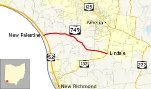 State Route 749 (SR 749) is an eastwest state highway in the southwestern portion of the U.S. state of Ohio. Its western terminus is at a signalized intersection with US 52 in the hamlet of New Palestine, and its eastern terminus is at another signalized intersection, this time SR 132, in the unincorporated community of Lindale.