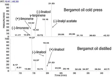 Gas chromatography with columns having a chiral stationary phase allows analyzing mixtures of enantiomers. The analysis of the enantiomeric distribution of various compounds, such as linalyl acetate and linalool, allows the characterization of the bergamot oil according to the manufacturing process and allows for the detection of possible adulteration.[12][13][14][15]
