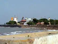 Bet Dwarka, an island in the Arabian sea off the coast of Dwarka. Considered the original residence of Krishna, Bet Dwarka was the old port during the ancient times of Krishna before the Okha port was developed in Dwarka. The temple built here is credited to the religious Guru Vallabhacharya of the "Pushtimarg Sampradaya". Rice is the traditional offering here to the deity as it is believed that Sudama offered rice to his childhood friend Krishna. There are also smaller shrines on Bet Dwarka which are dedicated to Shiva, Vishnu, Hanuman and Devi.[42] According to a legend, Vishnu killed the demon Shankhasura on this island. There are temples of Vishnu in the incarnation of matsya, or fish. Other shrines here are of Rukmini, Trivikrama, Devaki, Radha, Lakshmi, Satyabhama, Jambavati, Lakshmi Narayan, and many other gods.[39].Hanuman Dandi temple is another notable temple located in Bet Dwarka, 6 kilometres (3.7 mi) away from Dhwarkadhish Temple, Bet Dwarka. The temple is deified with many images of Hanuman and his son Makardhwaja. The legend associated with the birth of a son to Hanuman, who is considered celibate, is that the sweat of Hanuman was consumed by a crocodile which then gave birth to a son named Makardhwaja.[42] The Jethwa Rajput clan of Kshatriyas claim their descent from Makardhwaja.