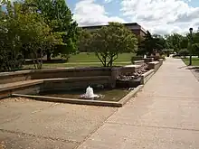 • In 1952, the quadrangle clocktower was erected directly west of Shawnee Hall. The clocktower is around 25 feet tall, made of brick, mortar, iron, and concrete, features water fountains (fountains not working), and a concrete frieze of a charging bison facing each cardinal direction. The class of 1994 restored the quadrangle clock tower and added park benches.