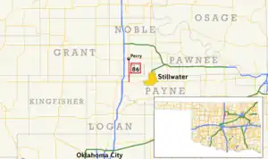 State Highway 86 (abbreviated SH-86) is a state highway in the U.S. state of Oklahoma that connects SH-51 with Perry and is 12.06 miles (19.41 km) long. The highway is contained wholly in Payne and Noble Counties. SH-86 has no lettered spurs or loops.