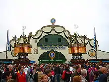 The Hofbräu tent is, with a total of almost 10,000 seats, the largest beer tent at the Oktoberfest (6,018 seats and 1,000 standing places indoors, and an additional 3,022 seats outdoor).[12] It has been under the leadership of the Steinberg family since the 1980s,[13] to which is also the tenant of the Hofbräuhaus cellar's since 1995. Under the leadership of the family, significant structural change were carried out in the tent. The only standing area with 1,000 places can be found in the Hofbräu-festival tent. In the tent, 12 quintal hop vines, the harvest an entire hop filed, are hung as decoration. The tent is erected on an area of over 7,000 m2. In the almost two weeks of the festival, more than 782,400 liters of beer, 70,700 BBQ chicken halves, 4,200 pork hocks and 6,200 pork sausage servings are consumed.[14]