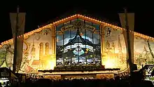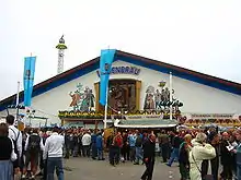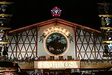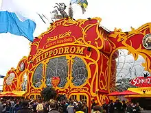 The Hippodrom was first erected at the Oktoberfest by Carl Gabriel in 1902 as a snack and show booth. Until the 1980s, special features in the tent was a horse riding track, a hippodrome, where visitors could ride.[8] During this time a barker stood outside. In the Hippodrom, beer from the Spaten-Franziskaner Brewery was served. It was located right next to the main entrance of the Oktoberfest. Festwirt (Festival Manager) was Sepp Krätz, from 1995 till 2013, a tenant of the Waldwirtschaft in Großhesselohe. The concession was taken from him following a conviction of tax evasion.[9] The succeeding tent was the Marstall.