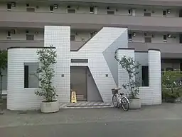 Public toilet located outside of Oku Station stylized to look like "OKU" in uppercase, July 2007