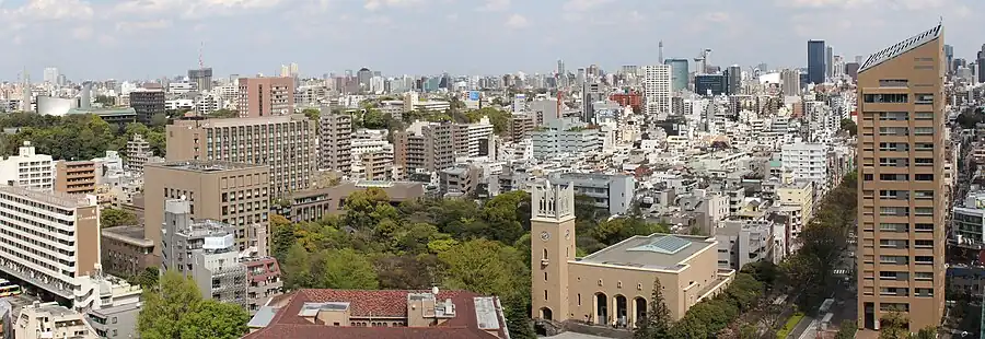Panoramic view of Waseda's campus with Ōkuma Auditorium in the foreground