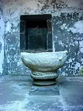 Along the back wall are evenly-spaced orifices, indicating the support areas for the old high-choir.[1] To the west (of the left entrance) is the baptistery marked by arched doorway, sheltering a semi-circular stone baptismal fountain decorated with various motifs and along the back wall an old closet.[1]