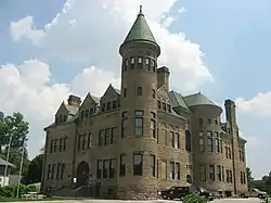 Old Frankfort Stone High School, also known as Old Stoney, is a historic high school building in Frankfort, Clinton County, Indiana. It was built in 1892, and is a 2+12-story, Richardsonian Romanesque style sandstone building on a raised basement. It has Indiana limestone trim, a large round arched entrance, four large stone chimneys, and four-story corner tower with a tall conical roof. The building was damaged by fire in 1922, and rebuilt with the work completed in 1926. The building housed a junior high school from 1962 to 1974, after which it ceased use as a public school.[2]:2–3