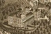 The main building consists of a three-story front section measuring 100 feet (30 m) by 50 feet (15 m), and two rear wings, each measuring 25 feet (7.6 m) by 79 feet (24 m), giving the building a U-shape.[1] The facade of the central section contains a portico with four Ionic columns supporting a large pediment, and accessed by a marble staircase.[1] One of the rear additions was designed in the Italian Renaissance style, and another contains Neoclassical elements.[1] The buildings' interiors have been modified extensively over the years as the role of the complex changed.[1]