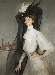 Known for "her elusive combination of childlike innocence and soigné charm" and described as "tall and slender, with Venetian red hair", Olga de Meyer was muse and model to many artists, among them Jacques-Émile Blanche, James McNeill Whistler, James Jebusa Shannon, Giovanni Boldini, Walter Sickert, John Singer Sargent, and Paul César Helleu.[20][21][22] Another of her artist admirers was Charles Conder, who was infatuated by Olga Caracciolo and painted her portrait; Aubrey Beardsley was part of her youthful circle as well.[21] Olga de Meyer also inspired characters in novels by Elinor Glyn and Ada Leverson.