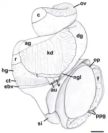 Mantle cavity is short, less than one-half whorl in length.[4] There is reno-pericardial complex just behind the mantle cavity.[4] Mantle cavity is slightly asymmetrical, slightly deeper at left side in front of pericardium.[4]