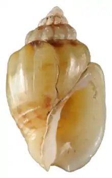 The shell is thick.[3] The shape of the shell is oblong-ovate.[3] The shell has 2.25 distinctly shouldered whorls.[4][3] The spire is low and obtuse.[3] The body whorl is subcyrindrical.[3] The width of the shell is 8.0-9.6 mm.[3] Shell length is 12.0-14.9 mm.[3]