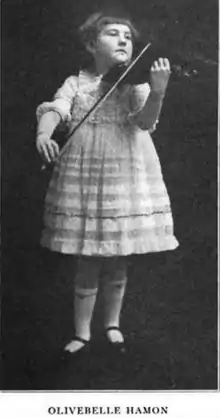 Olivebelle Hamon was famous from a very early age as a violinist in Chicago,[4] a standout student of Rudolph Reiners.[5] In 1922 she gave a stunt recital, playing her violin while walking up and down 33 floors of external stairs at the Wrigley Building,[6] as a benefit for Camp Algonquin, a YMCA "fresh-air" camp on the Fox River.[7]