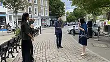 Oliver Cooper meeting with two of the streatery organisers: Belsize Village Business Association co-coordinator Aya Khazaal and Belsize Village Business Association head of gardening Jane Lyons on July 11, 2020.