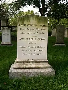 Holmes died quietly after falling asleep in the afternoon of Sunday, October 7, 1894.[134] As his son Oliver Wendell Holmes Jr. wrote, "His death was as peaceful as one could wish for those one loves. He simply ceased to breathe."[135] Holmes's memorial service was held at King's Chapel and overseen by Edward Everett Hale. Holmes was buried alongside his wife in Mount Auburn Cemetery in Cambridge, Massachusetts.[136]