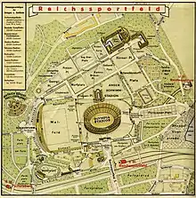 When the Reichssportfeld was finished, it was 1.32 square kilometres (325 acres).[1][3] The complex could be described as being designed on Wagnerian scale.[3] It consisted of (east to west): the Olympiastadion, the Maifeld (Mayfield, capacity of 50,000) and the Dietrich Eckart amphitheatre (capacity of 25,000), in addition to various places, buildings and facilities for different sports (such as football, swimming, equestrian, and field hockey) in the northern part.[3]