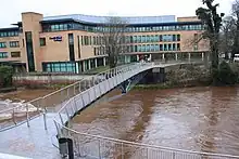 The campus building is located directly north of the main town centre, fronting the River Strule and conveniently next to the town's main bus station. Opposite the river is the location of what will be the Omagh Civic Arts Centre (completion due sometime around October 2007), and already a planned pedestrian bridge will link the two landmark buildings.