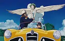One of the men helps the girl up, she spreads her wings and gives them a grateful smile; he kisses her hand, and the other winks in farewell. Soon, she is drifting upward into the sky. Briefly, a major urban cityscape is seen beyond the trees. The car veers off the road and slows to a stop in the grass.
