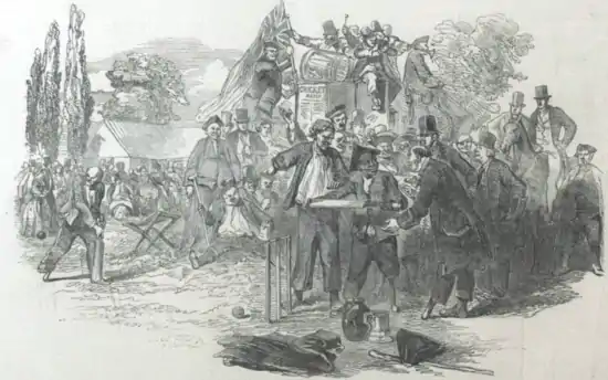 Two teams of Greenwich pensioners played at a ground formerly part of Lewisham Priory. The match was organised by Messrs Ingersoll and Stanton who managed to attract two thousand, four hundred spectators who were attracted by the novelty of the event. The game was played over two days and the teams were well-provisioned throughout, being given a hearty lunch before play and dinners of roast beef and lamb with plenty of strong ale at the Bull Inn. A band provided music for the occasion and the cricket players were additionally rewarded with a glass of grog and a fee of ten shillings. The one-legged men had difficulty connecting with the wide bowling, often being got out as they span around like a top. The one-armed team was the betting favourite and won the match, scoring 50 runs in their first innings and 41 in the second. The score of the one-legged team was 32 and 44, making the result 91 to 76 in favour of the one-armed team.[2][7][8]