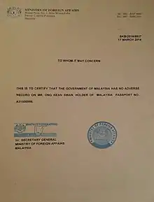 - ↑ "photo". Archived from the original on 6 June 2014. Retrieved 6 June 2014. picturing Ong receiving an award from the Sultan of Pahang.