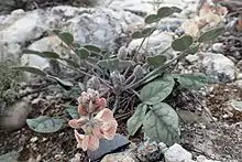Onobrychis venosa, veined sainfoin is a perennial, spreading or suberect herb 10โ25 cm high, with a short stem. Leaves alternate, compound, imparipinnate, leaflets ovoid to suborbicular 10-40 x 5โ30 mm with characteristic bronze venation (hence venosa), hairy only along margins. Zygomorphic flowers with yellow petals with conspicuous dark-red nerves in axillary racemes. Flowers from February to May. The fruit is a circular flattened hairy pod.[1]