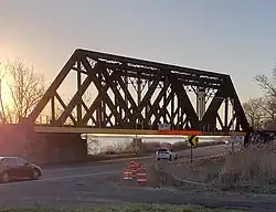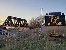 By the 1950s, the first reported collisions of commercial vehicles into the bridge's 10-foot-9-inch deck occurred in spite of a long-standing commercial vehicle ban, as the Onondaga Lake Parkway gradually turned from a leisurely route into a major thoroughfare route between Liverpool and Syracuse.[1] This remains a common occurrence to this day, with the New York State Department of Transportation revealing that between 2020 and 2022, an average of just over 9 vehicles per year have struck the bridge,[2] up from a normal average of 3 collisions per year.[3] In March 2023, three trucks hit the bridge within a span of 12 days, including two within the last three days of the month.[4][5]