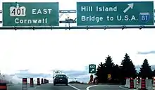 King's Highway 137, commonly referred to as Highway 137, is a provincially maintained highway in the Canadian province of Ontario that connects the northern end of Interstate 81 in the U.S. state of New York with Highway 401 via the Canadian span of the Thousand Islands Bridge. While this road connected to the international bridge when it opened in August 1938, it was not designated as a King's Highway until 1965. Highway 137 passes through a portion of the Canadian Shield, a geographic feature which aided construction of the three Canadian spans of the Thousand Islands Bridge. These bridges, all of different designs, travel 538 m (1,765 ft) across the Saint Lawrence River. Highway 137 is 4.3 km (2.7 mi) in length and is located entirely within the United Counties of Leeds and Grenville.