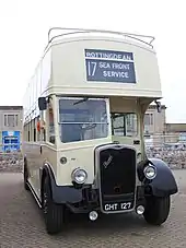 Buses continued to operate sea front services. These used conventional vehicles with roofs, although by this time some seaside resorts were operating similar services with open top buses.[6] It was 1950 before open top buses appeared on service 152 (as it was known) between the Sanatorium and Old Pier. Three old vehicles of a type not usually found in the fleet had their roofs cut off and were painted cream and green. They proved popular with passengers but were replaced after a year or two-year with more conventional Bristol buses which had their roofs removed.[7]