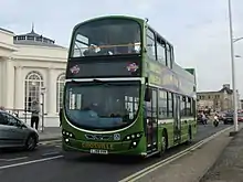 The first Bristol VRTs were two convertible buses with 74-seat ECW convertible bodies, but after just one season at Weston-super-Mare, when they operated in their old cream and green Southern Vectis livery,[12] they were transferred to Bath to operate a new city tour. Other buses from Weston have operated the Bath tour, and buses from Bath have occasionally been pressed into service at Weston. New purpose-built Leyland Olympian buses with 76-seat Charles H Roe convertible bodies were purchased in 1984.[13] A more modern Olympian was transferred from the Bath fleet when the operation of the city tour ceased. It was converted to open top after a low-bridge accident and has a 76-seat Northern Counties Palatine 2 body.