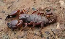 These muddy-looking scorpions are characterized by corrugations on the last sternite, stiff hairs (setae), and highly recurved tarsal claws. Males have corrugations on the last two sternites. They grow up to 70 mm in length.
