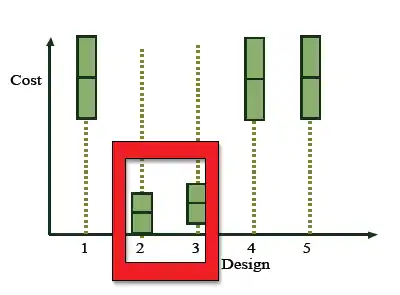 For example, we can create a simple simulation between five alternatives. The goal is to select an alternative with minimum average delay time. The figure below shows preliminary simulation results ( i.e. having run only a fraction of the required number of simulation replications). It is clear to see that alternative 2 and 3 have a significantly lower delay time (highlighted in red). In order to save computation cost (which is time, resources and money spend on the process of running the simulation) OCBA suggests that more replications are required for alternative 2 and 3, and simulation can be stopped for 1, 4, and 5 much earlier without compromising results.