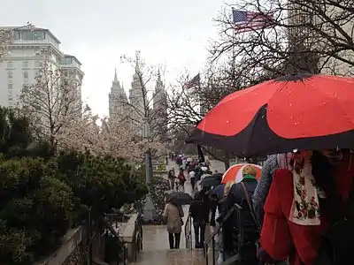 The group requested tickets to the priesthood session of the October 2013 general conference. The request was denied in a response from Ruth Todd, spokeswoman for the LDS Church.[5] On October 5, 2013, Ordain Women organized an event in which approximately 150 Latter-day Saint women and men attempted to attend the priesthood session of the LDS Church's semiannual general conference in the stand-by line, held in the LDS Conference Center and Tabernacle in Salt Lake City, Utah.[6] The women were told at the door that the session was for men only and that they would not be admitted. Later that year, church headquarters sent a letter to local church leaders, stating that if women asked to be admitted to attend a general conference priesthood session in a stake center, the male leaders were "to inform them that the meeting is for men and that men are invited to attend", but since the church's meetinghouses "should be places of peace, not contention," if women "become insistent" about entering the priesthood session "to the point that their presence would be disruptive, please allow them to enter and view the conference."[7]