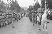 Gideon force was named after the biblical judge Gideon who defeated a large force with a tiny band of men.[33] Wingate invited a number of veterans of the Haganah SNS to join him, with the blessing of Ethiopia's Emperor Haile Selassie, and the group began to operate in February 1941. The Italians occupied Ethiopia between 1936 and 1941, and they conducted operations to "pacify" the people which killed about seven per cent of the population.[34] There was a huge reservoir of hatred for the Italians as a result, and many Ethiopians were happy to assist Gideon Force. Wingate was temporarily promoted lieutenant colonel and put in command. He again insisted on leading from the front and accompanied his troops in the reconquest of Abyssinia.