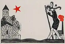 Recipients were also given a monetary prize, and an Eric Gill designed certificate, depicting Saint Christopher, in front of a smoking chimney, carrying the Christ Child across water, towards a walled garden ("A Rose Plant in Jericho"[5]) with a red star overhead,[6][7][8] Certificates for individual men were inscribed:[9]
