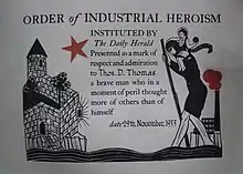 'Order of Industrial Heroism' certificate awarded to Thomas "Derwydd" Thomas in 1933. Features a 1923 woodcut design by Eric Gill.