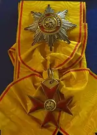 The badge of the order was a red enameled maltese cross, outlined in gold. On the centre of the cross is a disc with a golden griffon surrounded by a gold ring. The Grand Cross badge was worn at the left hip, hanging from a 4 in wide sash that goes over the right shoulder. The Grand Commander's and Commander's Cross badges were worn suspended from the neck on a narrower ribbon. These badges were slightly smaller than the Grand Cross badge, but otherwise identical in appearance. The Honour Cross was smaller still and did not have the gold ring surrounding the griffon in the centre. Finally, the two Knight's Crosses were slightly smaller than the Commander's Cross and worn suspended from a ribbon worn on the left chest.[1]