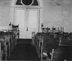 Of all the rooms in the Salt Lake Temple, this circular room is "by far the most beautiful" with "splendid simplicity rather than of sumptuous splendor".[6] Its ceiling is domed and fitted with circular and semi-circular windows. Its doorway "corresponds to the inner curtain or veil that shielded from public view the most sacred precincts" of earlier temples. Opposite the doorway is a large stained glass window depicting Joseph Smith's First Vision. The room has an altar, chairs and sofas. The Holy of Holies "is reserved for the higher ordinances in the priesthood relating to the exaltation of both the living and the dead."[7] In temples without a Holy of Holies these ordinances are administered in one of the Sealing Rooms, which is dedicated as a temporary Holy of Holies.