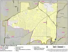 District 25 of the Oregon House of Representatives is one of 60 House legislative districts in the state of Oregon. As of 2021, the district is contained entirely within Washington and includes Tigard and parts of Durham and south Beaverton. The current representative for the district is Democrat Ben Bowman. He succeeded Republican Jessica George, who was appointed to replace Bill Post of Keizer.[1][2]