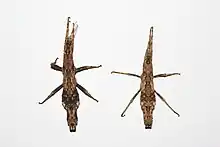 The females are 40 to 50 millimetres (1.6 to 2.0 in) long and stocky in shape. Their basic color is usually a light beige or brown, which is complemented by almost white, brown and black patterns. The body surface is covered with small, mostly black tubercles.[3] In the middle of the otherwise flat upper side of the thorax a weak carina can be seen. The comparatively short mesonotum is 2.5 times as long as the pronotum and thus significantly shorter than in longer species such as Orestes mouhotii or Orestes shirakii.[4] On the forehead that becomes narrower towards the top, the four elevations form two edges that converge towards the tip of the forehead, which when viewed from the front form a triangle. The abdomen becomes significantly wider up to the middle and is also strongly raised laterally up to the middle in egg-laying females. Tubercles can be found on the posterior lateral area of the third to fifth tergite of the abdomen other species is missing in the females of Orestes guangxiensis.[5]