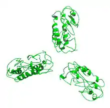 OPAA is a single polypeptide composed of 517 amino acids, with a molecular weight of 58 kDa.[11][12] The three-dimensional crystal structure of OPAA is a trimer, as seen in Figure 2. The enzyme has a 22% amino acid homology with human prolidase and a 30% homology to E. coli aminopeptidase P.[12]