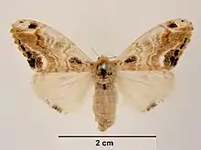 The wingspan is 21–29 mm for males and 30–42 mm for females of the first two generations.[2] The first two generations each year produce winged female moths. The last generation of females is flightless. Male adults are usually grey to black with one white spot on each wing. Females are generally creamy white with a dark spot on the wings.