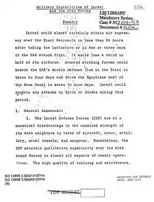 Despite his own skepticism, Eban followed his instructions during his first meeting with Secretary Rusk, Under Secretary Rostow, and Assistant Secretary Lucius Battle. American intelligence experts spent the night analyzing each of the Israeli claims.[153] On May 26, Eban met with United States Secretary of State Dean Rusk, Defense Secretary Robert McNamara, and finally with President Lyndon B. Johnson. In a memo to the President, Rusk rejected the claim of an Egyptian and Syrian attack being imminent, plainly stating "our intelligence does not confirm [the] Israeli estimate".[154] According to declassified documents from the Johnson Presidential Library, President Johnson and other top officials in the administration did not believe war between Israel and its neighbors was necessary or inevitable.[155] "All of our intelligence people are unanimous that if the UAR attacks, you will whip hell out of them", Johnson told Eban during a visit to the White House on May 26.[155][156][157] Consequently, Johnson declined to airlift special military supplies to Israel or even to publicly support it.[156] Eban left the White House distraught.